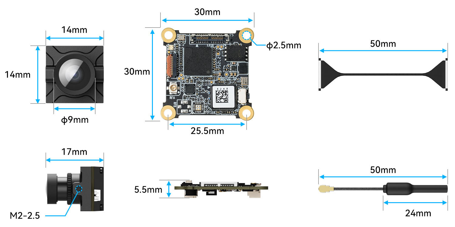- Видеопередатчик: 30 × 30 × 5,5 мм
