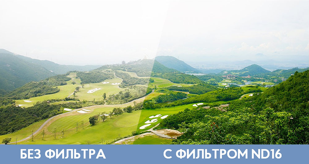 Нейтральный фильтр эффективно предотвращает проникновение света на матрицу камеры на 4 ступени диафрагмы. Это позволяет получать фотографии и видеоролики превосходного качества как в солнечные, так и в облачные дни. Более того, используя светофильтр ND16 пользователь без проблем получит натуралистичное размытие картинки практически в любую погоду.