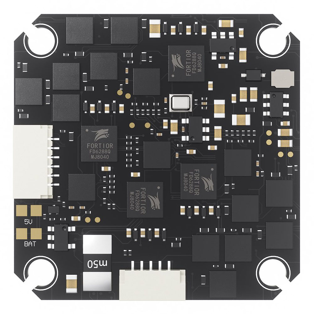Наличие 5 полноценных UART-портов и специального 6-контактного разъёма для прямого подключения цифровых видеопередатчиков избавляет от лишней пайки и делает сборку максимально аккуратной. Прошивка Bluejay для ESC гарантирует плавный и отзывчивый контроль газа, обеспечивая идеальную управляемость в полёте.