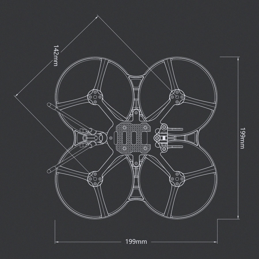 - Размер рамы (от мотора до мотора по диагонали): 142 мм