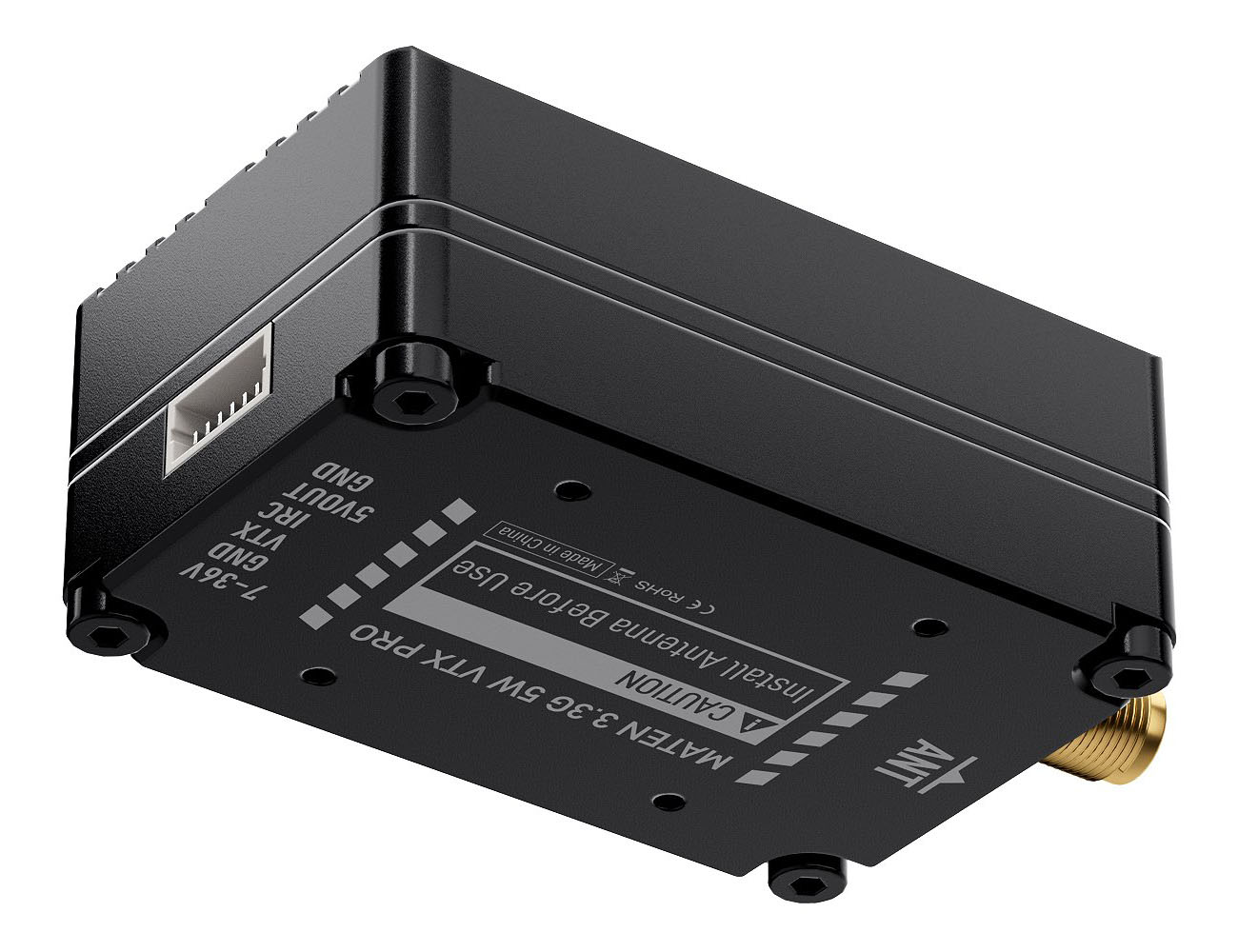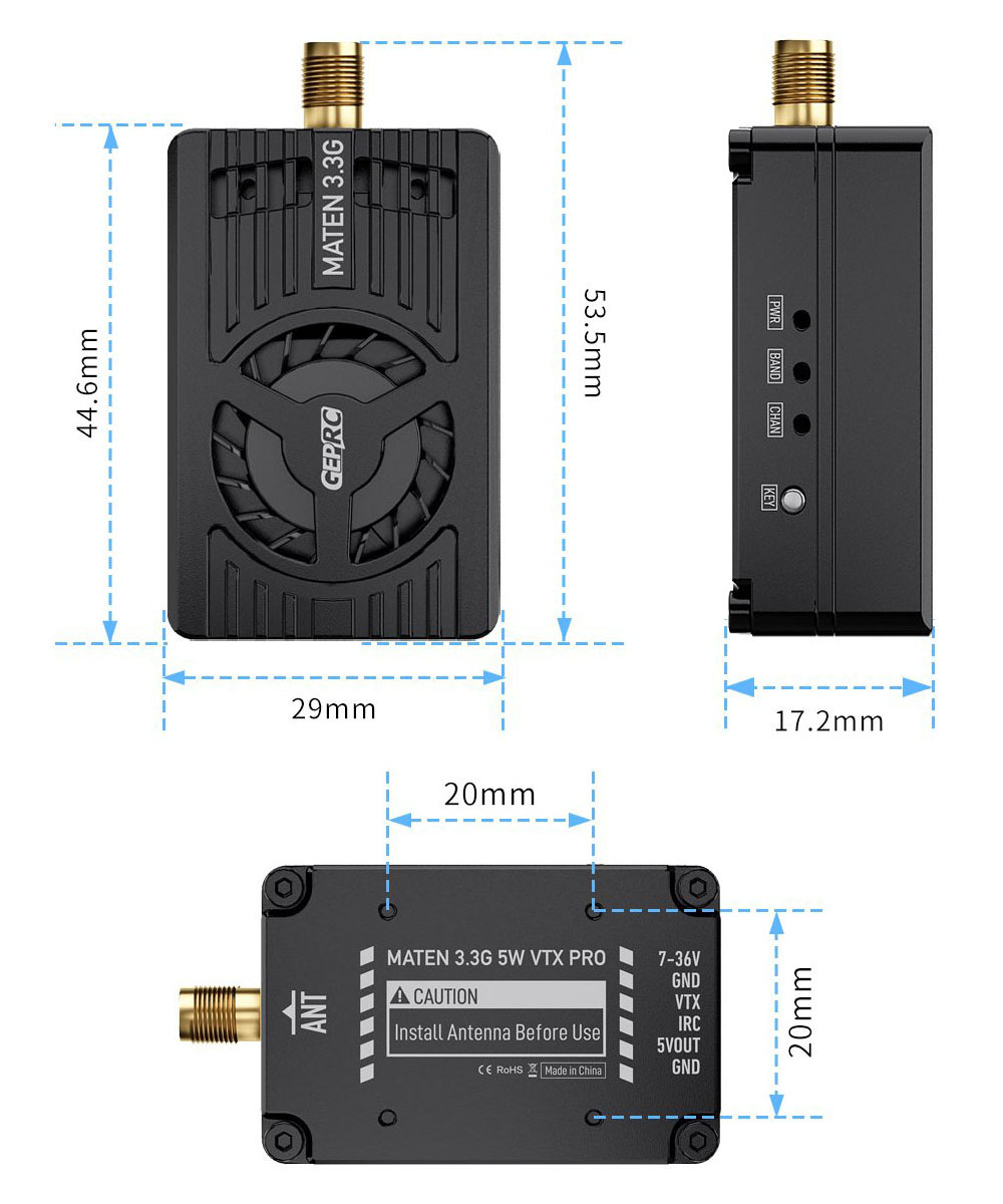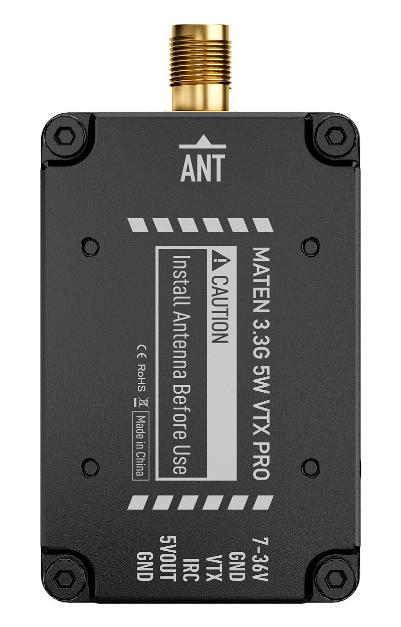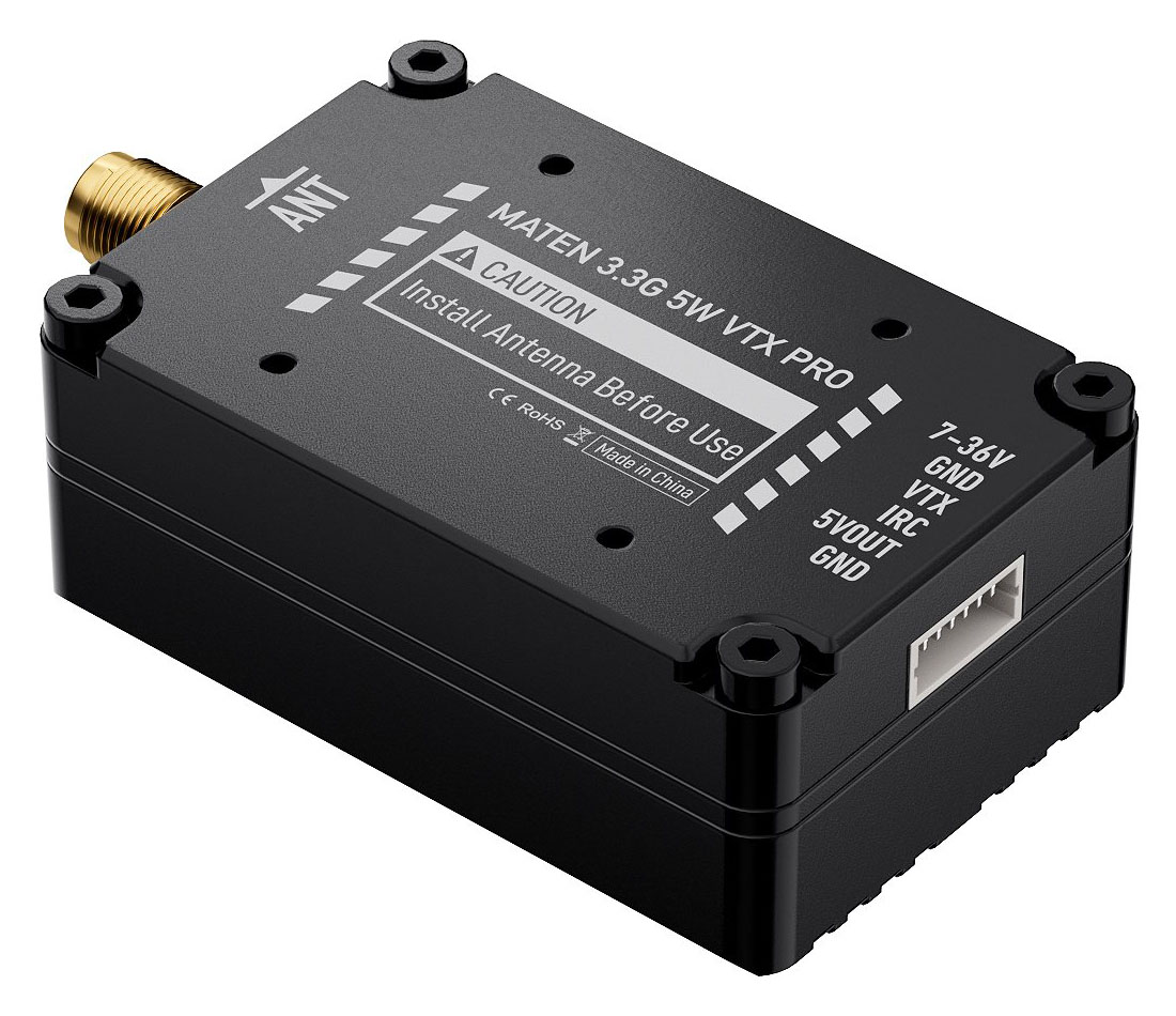 Видеопередатчик GEPRC MATEN VTX PRO работает на частоте 3,3 ГГц и имеет максимальную мощность 5 Вт. Поддерживает 48 каналов, оснащён функцией контроля температуры и защиты от перегрева. Работает на протоколе IRC Tramp и имеет широкий диапазон входного напряжения 7–36 В.