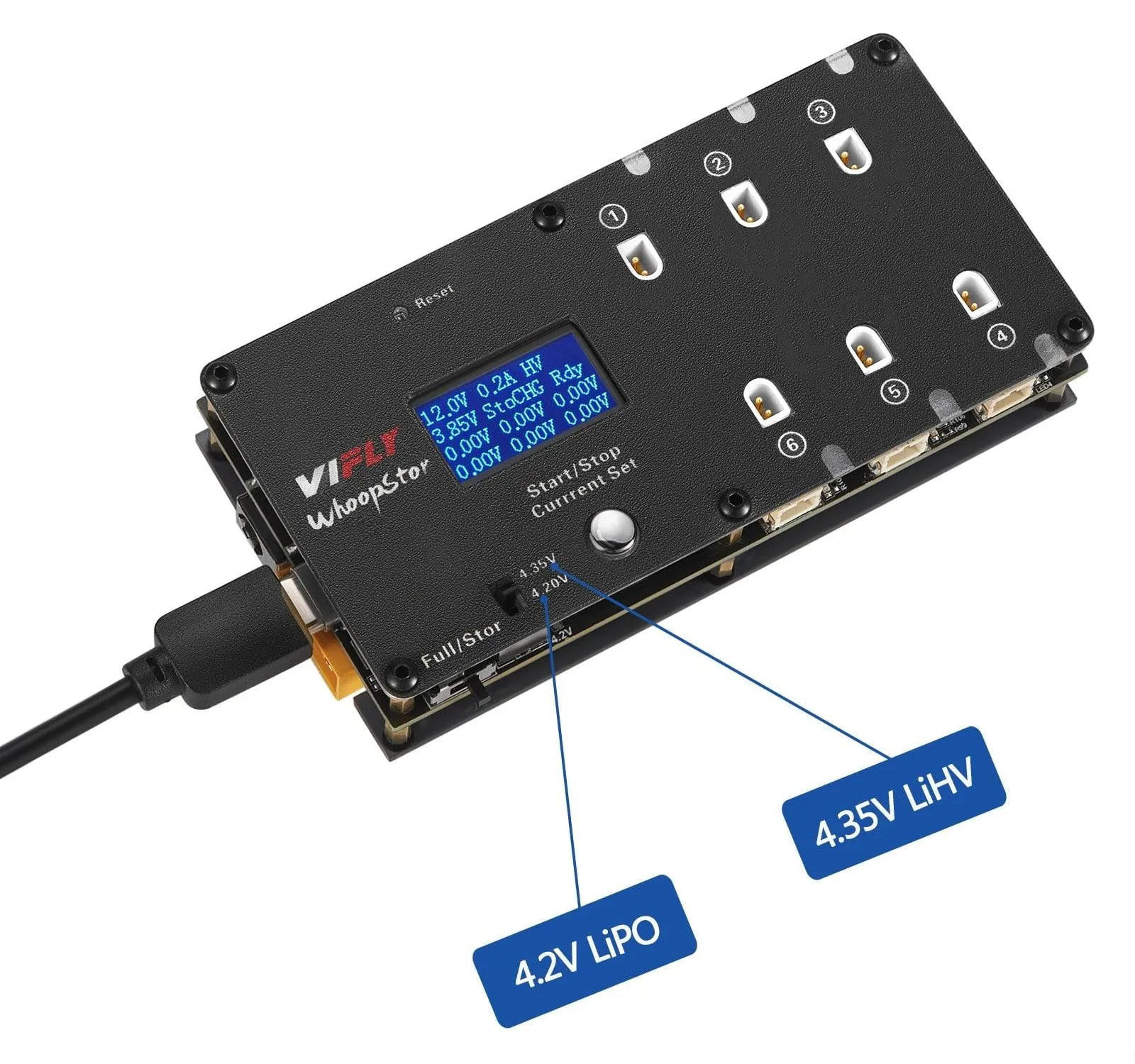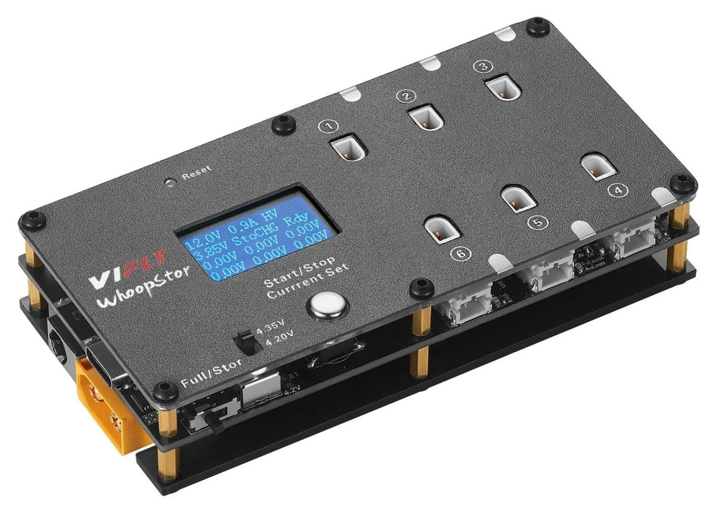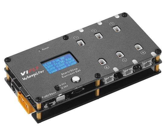 VIFLY WhoopStor V2 — шестиканальное зарядное устройство для 1S аккумуляторов со встроенной функцией Storage (режим хранения). Каждый канал работает независимо и оснащён сразу двумя типами разъёмов: PH2.0 и BT2.0. Питание устройства универсально: можно использовать сетевые адаптеры через Type-C или DC-разъём, а также LiPo аккумуляторы через XT60 в полевых условиях.