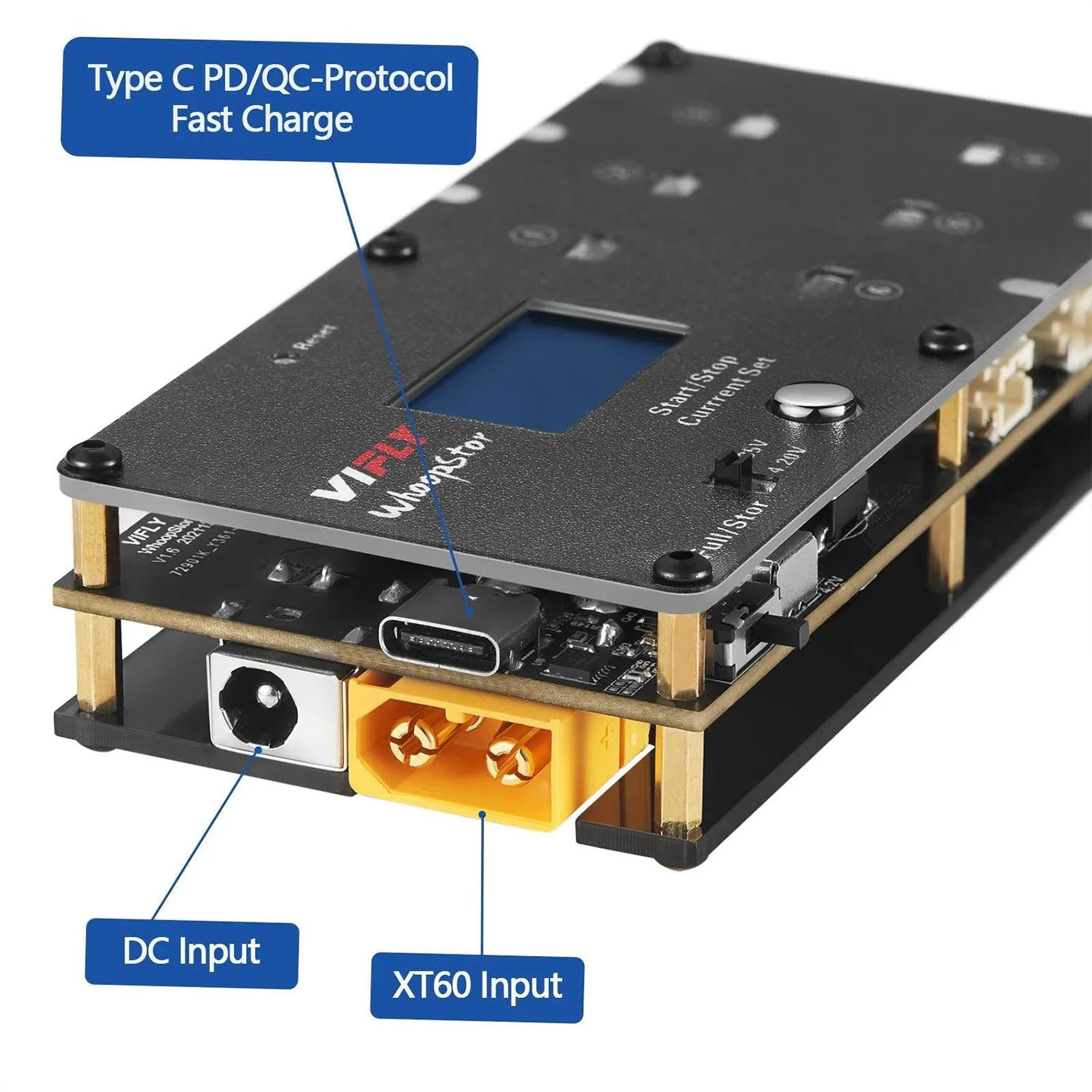 Для удобства использования WhoopStor V2 оснащён цветным OLED-дисплеем, отображающим напряжение, ток и статус каждого канала.
